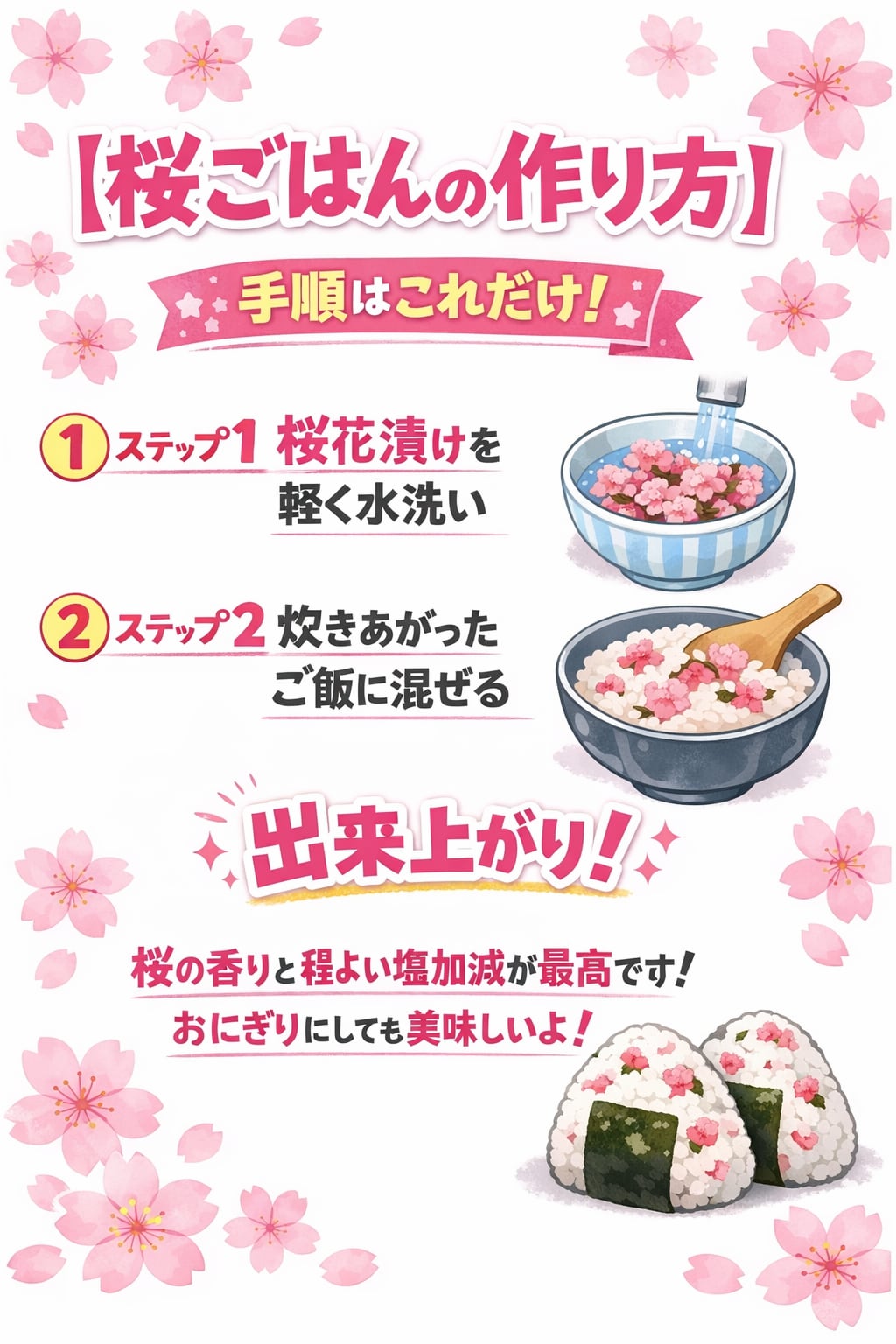 国産の八重桜。桜湯にするのがもっともポピュラーですが、ケーキやクッキーなどのお菓子作り、桜ごはんや、お酒に入れたりと使い方も様々。春の香りを取り入れて、爽やかな気分も演出!ピクニックに桜ご飯のおにぎりを持参も素敵です。 *桜ごはん* 炊き上がったご飯に、水洗いして食べ易い大きさに刻んだ桜花漬けを混ぜるだけ!! (桜花漬け1pで、ご飯2合が目安です。)