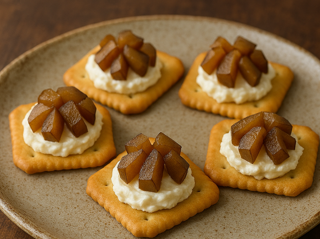 なるほど、香ばしいクラッカーの上にフレッシュで濃厚なチーズ、更に薫香と歯応え、かすかな甘味が特徴のいぶりがっこ・・・合うでしょうね。